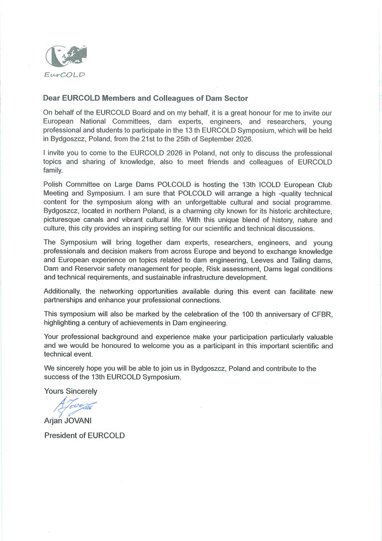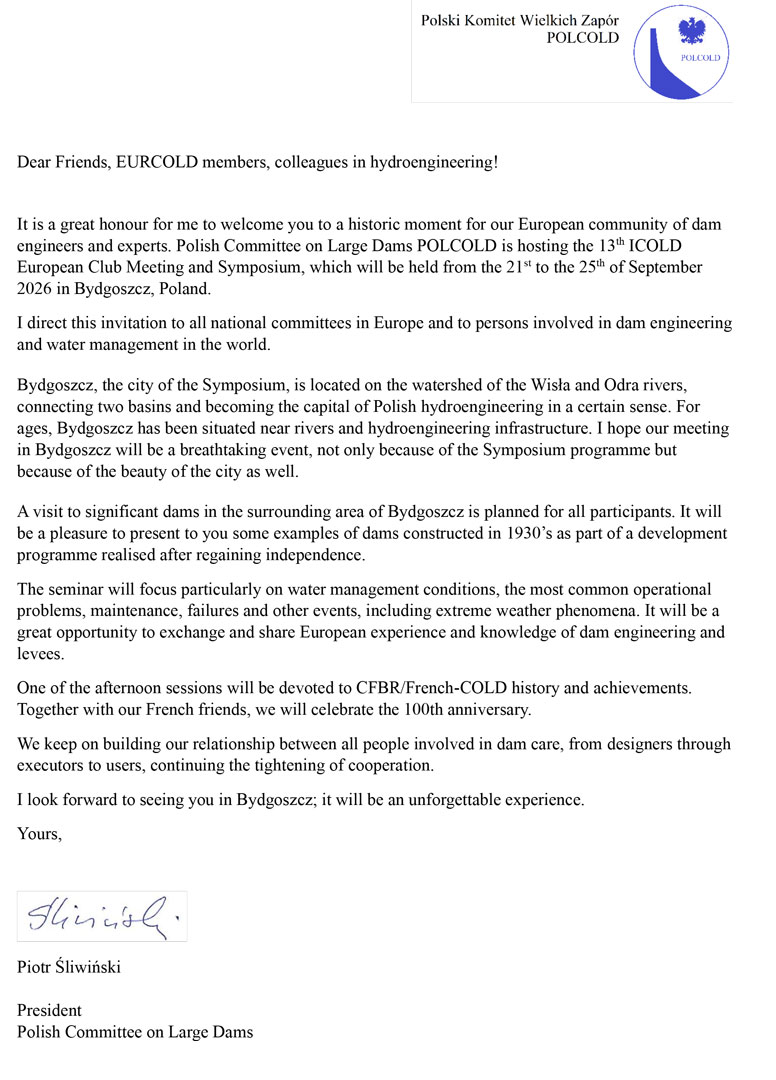 Polish Committee on Large Dams (POLCOLD) is happy to invite You to the 13th ICOLD European Club Symposium, which will be held from the 21st to the 25th of September 2026 in Bydgoszcz, Poland.